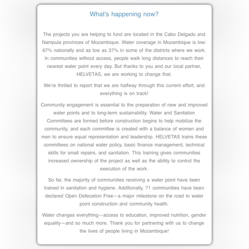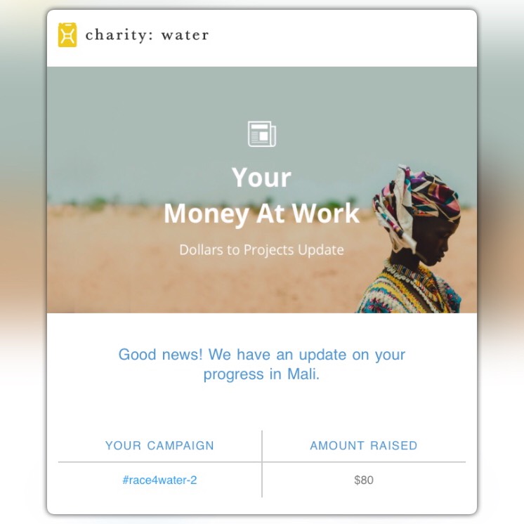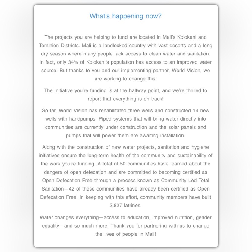 We have been notified by Charity: water that the donations from this campaign have been sent to begin projects in the Kolokani & Tominion Districts of Mali!